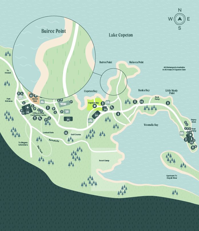 The nearest bathrooms to Copeton Waters Buiree Point are a short drive away at the park's amenity blocks. Alternatively, porta loos can be arranged.