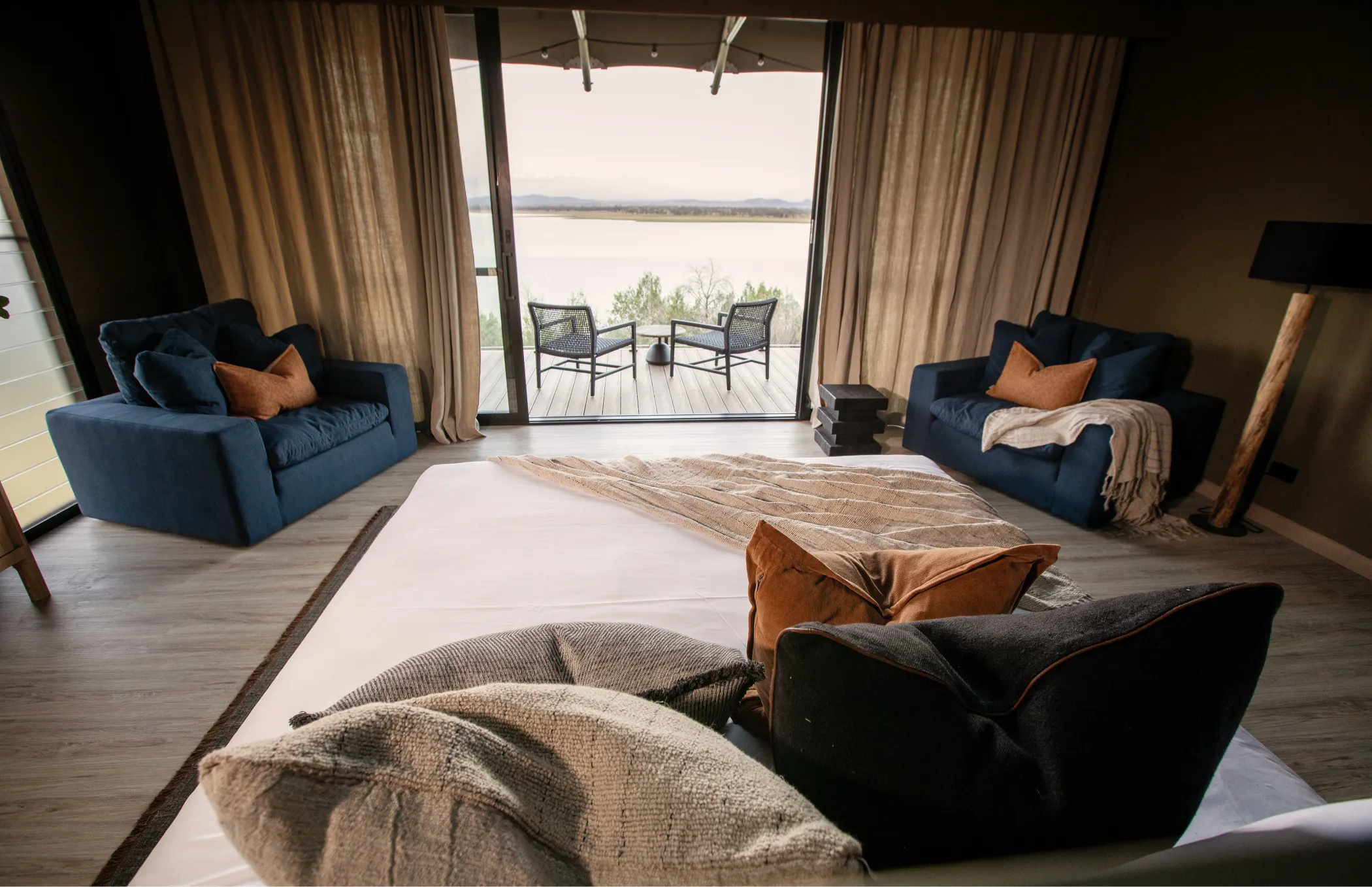 Wilderluxe Lake Keepit has been designed as an intimate experience for guests, with a small footprint infrastructure. Eight “Star Tents” and a private guest lounge are perched above the lake, cushioned by the surrounding countryside and the Great Dividing Range, offering a majestic panorama.